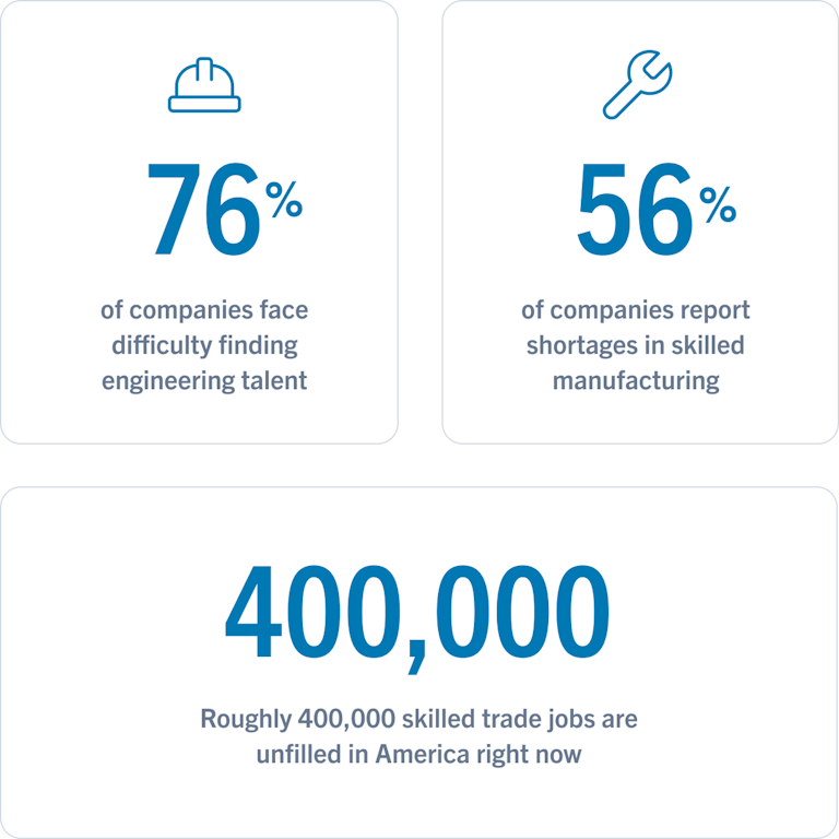 According to a recent study by the Aerospace Industries Association, 76 percent of companies face difficulty finding engineering talent and 56 percent report shortages in skilled manufacturing. Many of these positions offer salaries and benefits upwards of $100,000 per year.