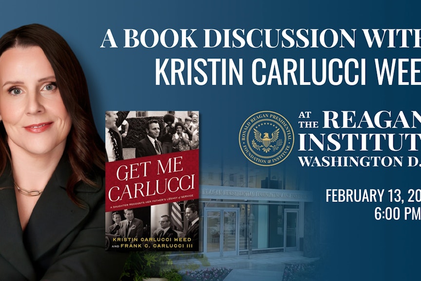 Please join the Ronald Reagan Institute on Tuesday, February 13th from 5:00 - 7:30 PM for a discussion with Kristin Carlucci Weed on her newly released book, "Get Me Carlucci: A Daughter Recounts Her Father's Legacy of Service." The evening will start with a cocktail hour beginning at 5:00 PM, followed by a book discussion and a book-signing with Kristin Carlucci Weed.