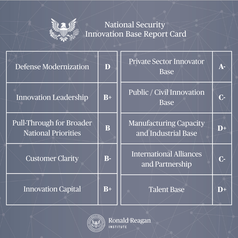 The Reagan Institute brought together a bipartisan group of former policymakers, national security experts, innovators, and industry leaders to advise on the report card, which assesses and grades the national security innovation ecosystem across ten key indicators.